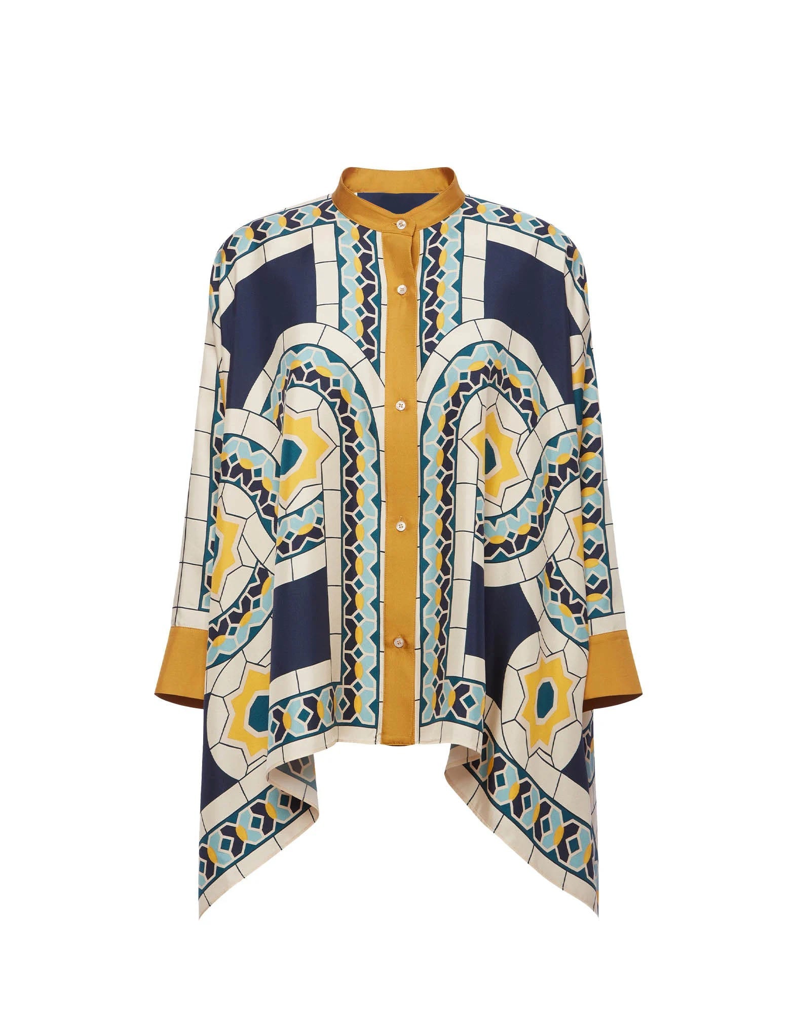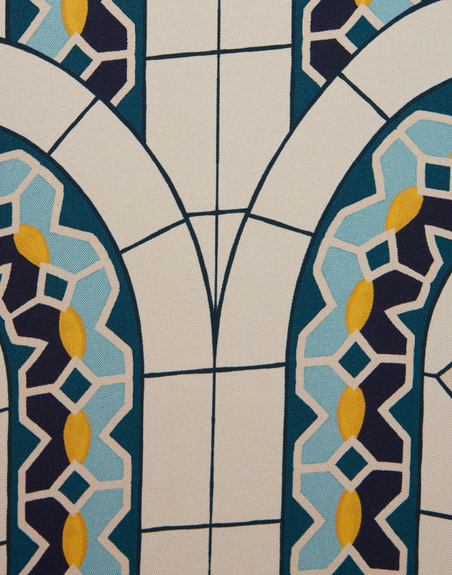 • Intricate mosaic-inspired geometric prints in mustard, teal, and ivory, reminiscent of Mediterranean tile artistry.