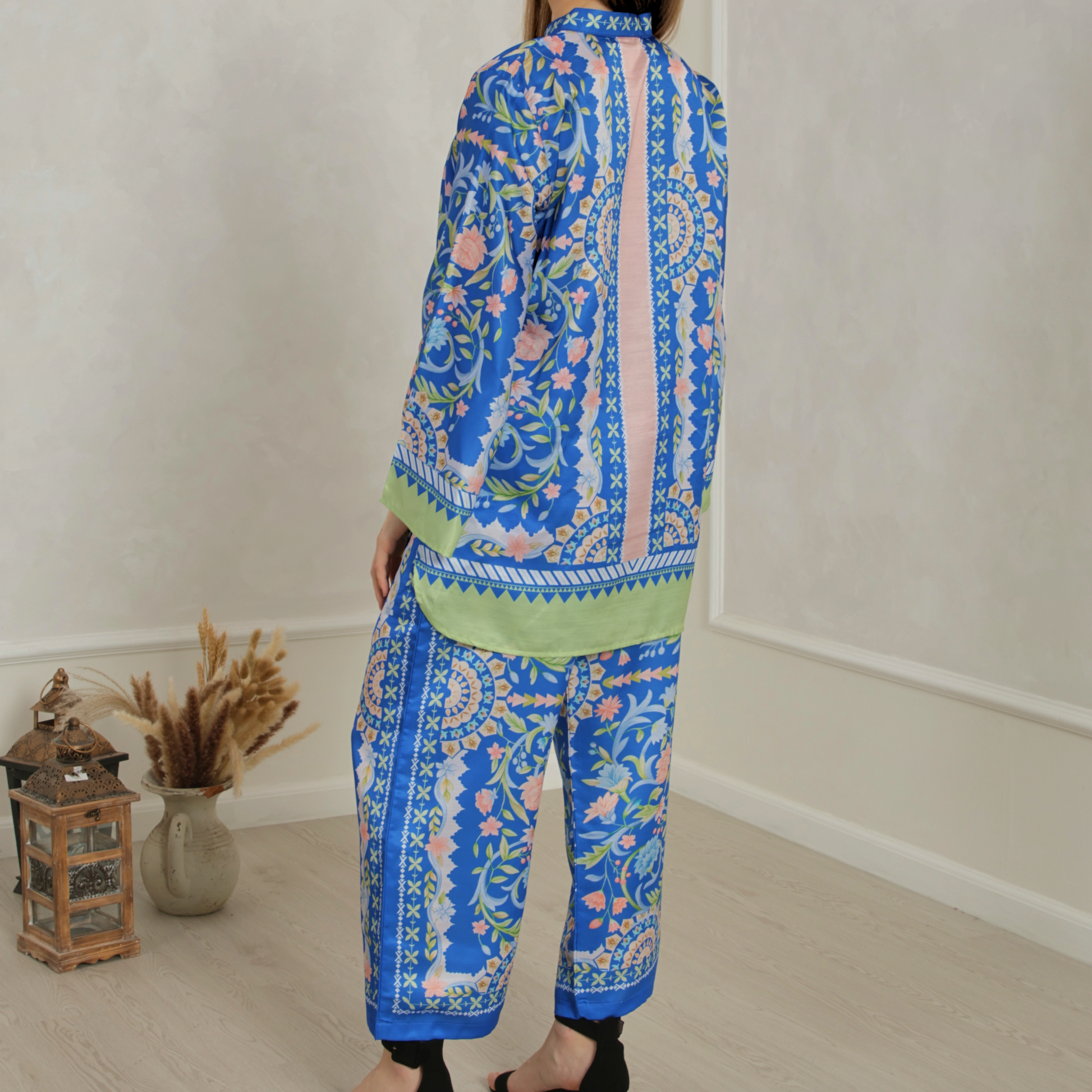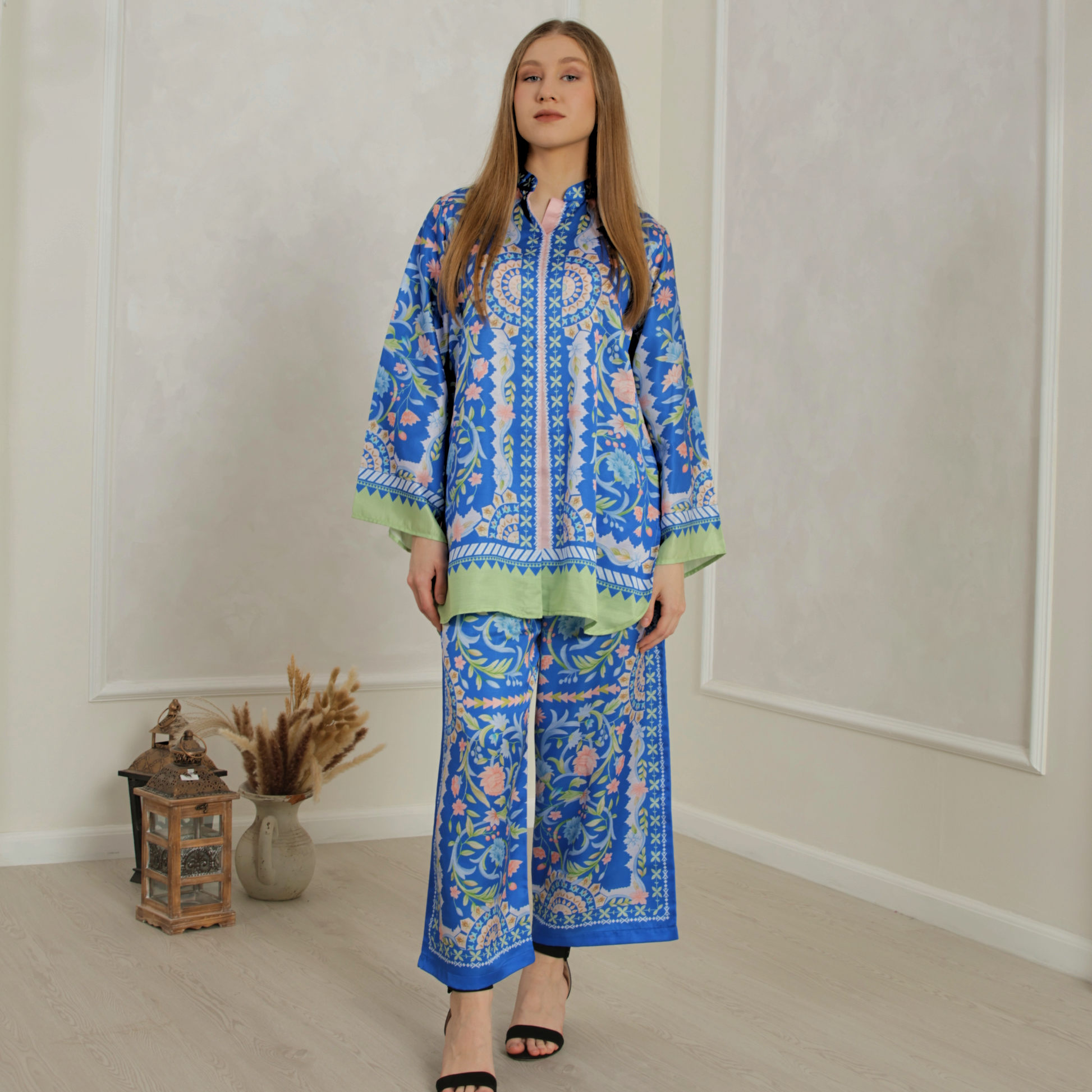 - A vibrant blend of royal blue, soft pastels, and green, inspired by botanical and baroque artistry.